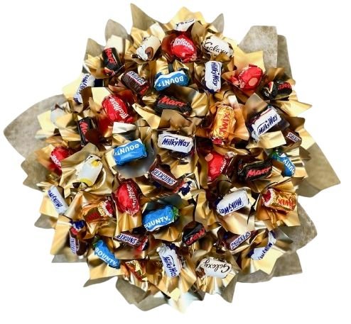 The chocolates and candies are artistically arranged in a bouquet style, giving it a sophisticated look that mimics a traditional floral bouquet. The bouquet is elegantly wrapped and tied with a satin ribbon for a beautiful presentation. A fun and unique way to express your love or appreciation, ideal for Valentine’s Day, anniversaries, or a thoughtful and indulgent gift for anyone with a sweet tooth – friends, family, or colleagues will appreciate this delicious surprise.
