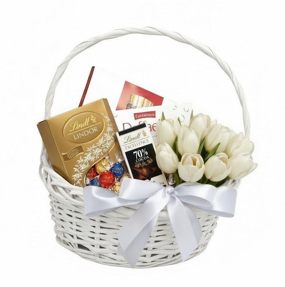 A Little Basket of Tulips & Chocolate – Flowers and Sweet Indulgence