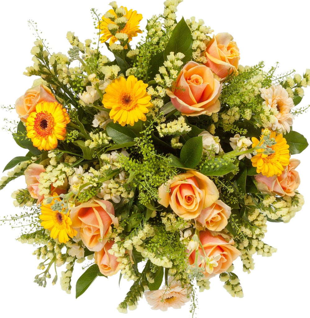 Capture the sunshine with our A Touch of Summer Flower Bouquet, a stunning floral arrangement that embodies the warmth, colour, and joy of summer. Featuring a radiant mix of peach roses, yellow gerbera daisies, peach gerberas, ivory stocks, yellow limonium, and lush green bell and salal foliage, this bouquet delivers a refreshing burst of seasonal beauty.