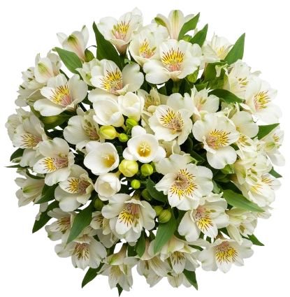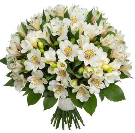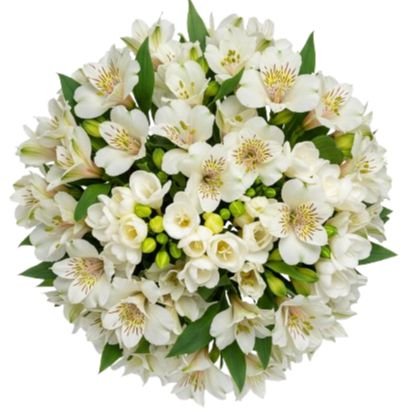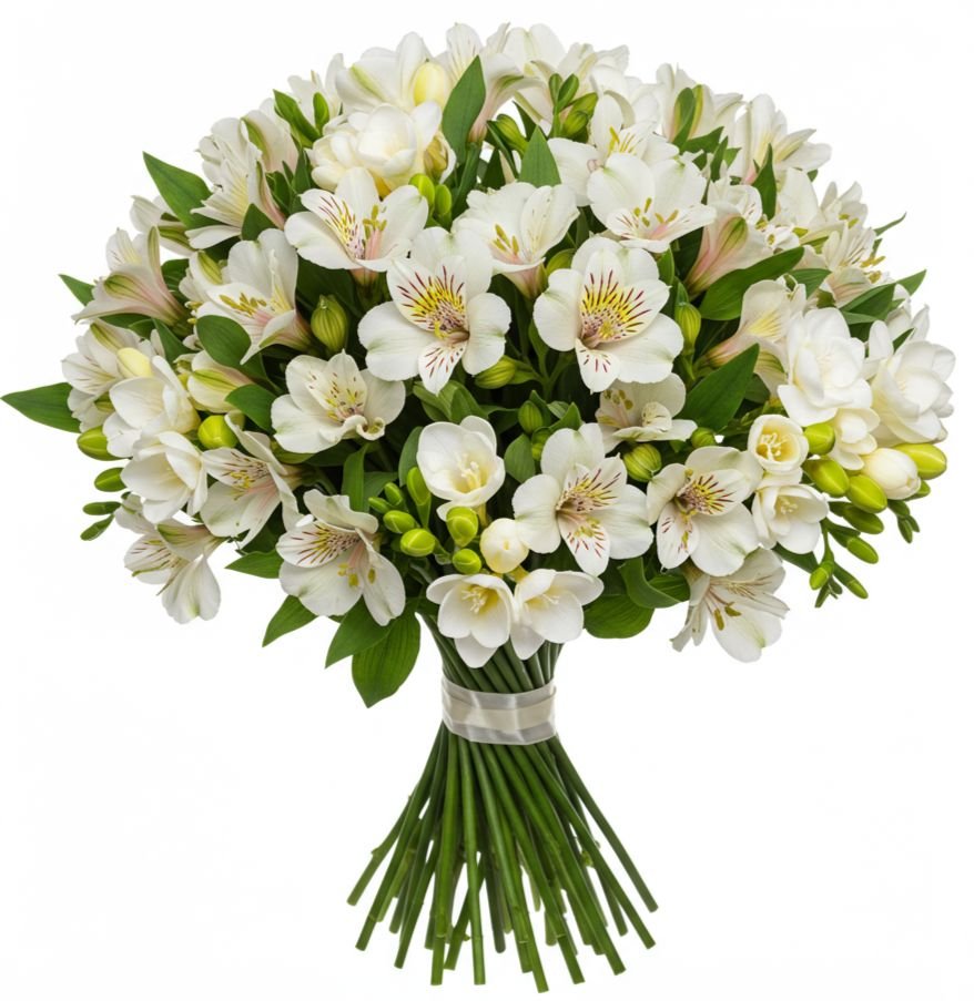 - White Freesias: are renowned for their soft, sweet fragrance and delicate blooms, symbolizing friendship, innocence, and purity. Their gentle white petals harmonize beautifully with the vivid tones of alstroemeria, creating a bouquet that is visually balanced and pleasing.