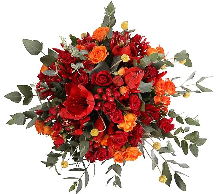 - Orange Spray Roses: complementing the red, the orange spray roses introduce warmth and a cheerful autumn vibe.