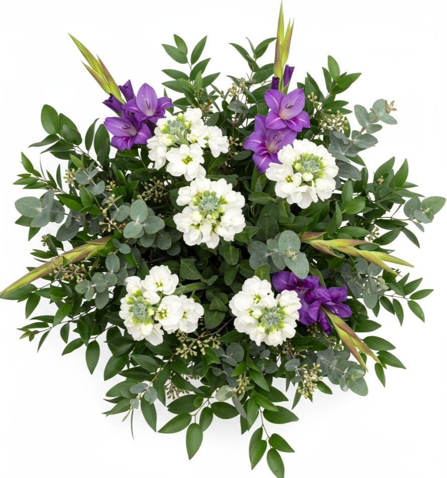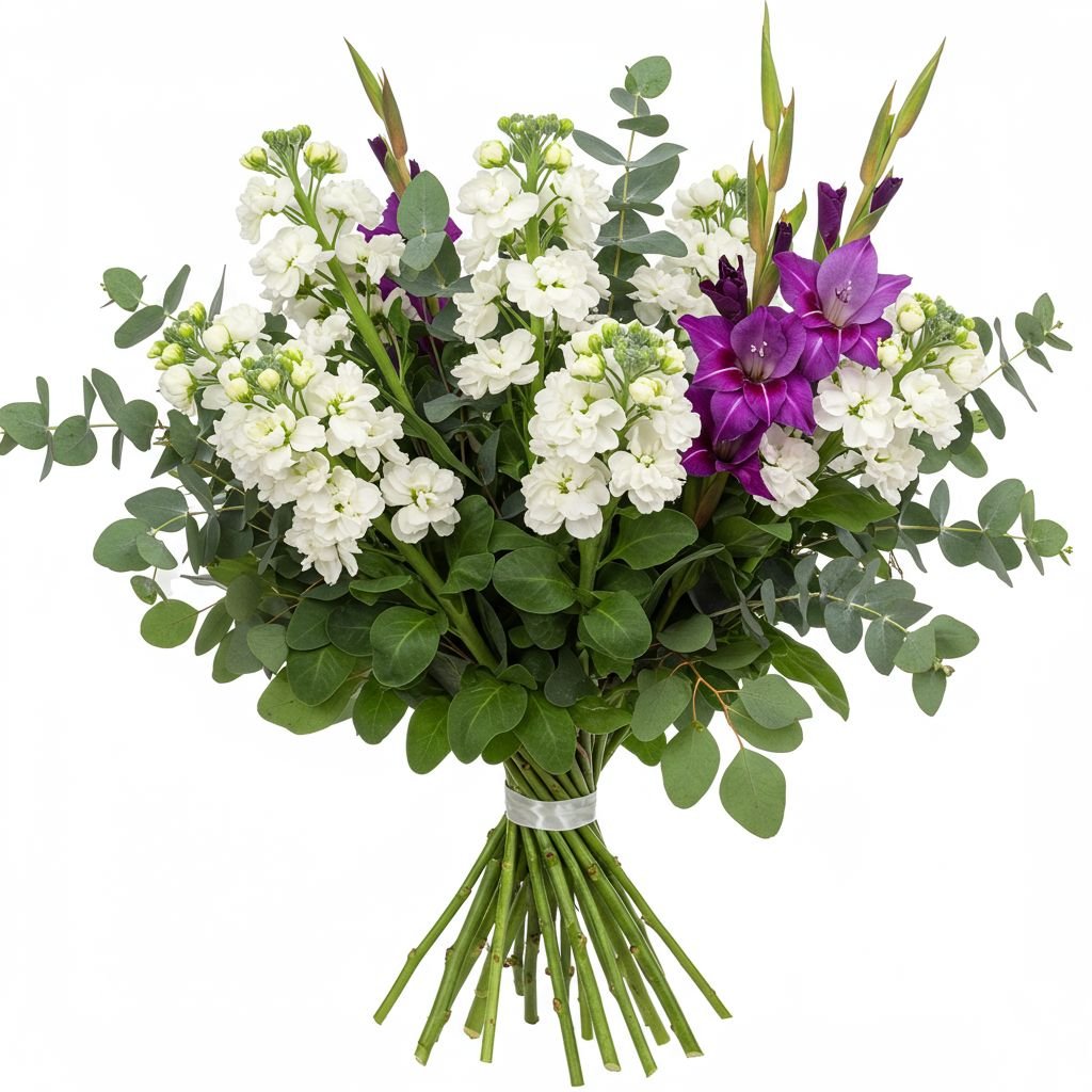 Create a lasting impression with our Amazing Bouquet of White Stock and Gladioli, a sophisticated arrangement that blends pure elegance with natural fragrance. Featuring fragrant white stock, striking gladioli in the color of your choice, and fresh eucalyptus greenery, this bouquet is perfect for expressing sympathy, celebrating milestones, or simply brightening someone’s home.