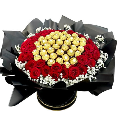 This arrangement is more passionate than words, making it the perfect way to express your feelings and show you care. The combination of roses and gypsophila adds a timeless charm, while the luxurious chocolates bring a sweet touch of indulgence.