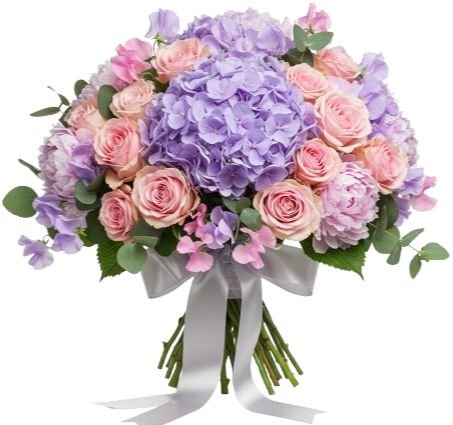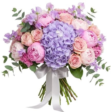- Purple Hydrangea: complements the peony with its voluminous blooms and rich color. Its presence adds depth and texture to the bouquet, creating a stunning visual contrast that enhances its overall allure.