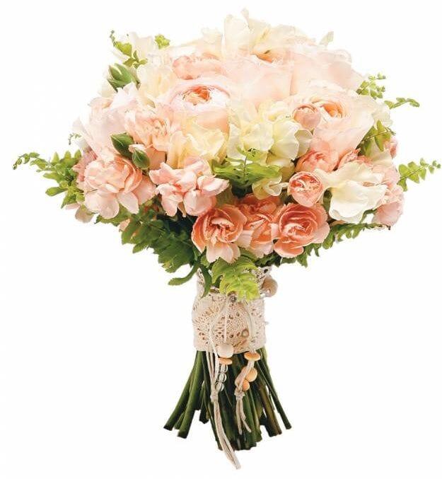 The Apricot Bridal Bouquet is a soft, sophisticated floral arrangement designed with romance and grace in mind. Featuring peach garden roses, white sweet peas fragrant blooms, peach spray carnations, and lush greenery, this bouquet is the perfect choice for a bride who loves timeless beauty with a modern touch.