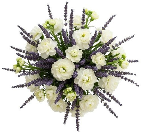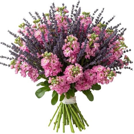 Each bouquet is hand-tied with care to ensure freshness and aesthetic balance, making it a wonderful addition to any home or a memorable gift for someone special. Perfect for birthdays, thank you gift, housewarmings, or simply as a thoughtful gesture, this bouquet blends the soft colors and textures of stocks with the unmistakable aroma of lavender. The combination not only looks graceful but also fills any space with a relaxing, natural scent.