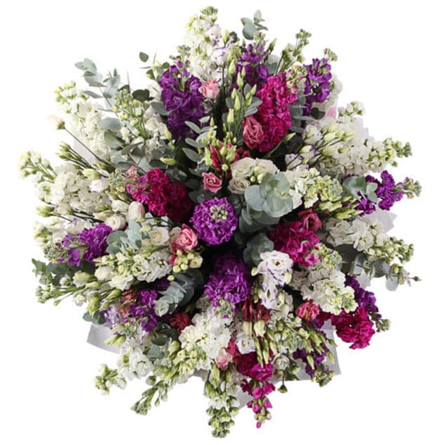 Indulge in the timeless beauty and soothing fragrance of our Aromatic Matthiola and Lisianthus Bouquet. Featuring a rich combination of white matthiola, cerise matthiola, purple matthiola, dark pink lisianthus, Two-Tone white and purple lisianthus, and fresh eucalyptus greenery, this bouquet brings together bold colours, delicate textures, and a naturally sweet scent perfect for elevating any space.