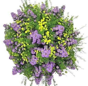 - Purple Aster Flowers: these star-shaped blooms bring a burst of color and elegance to the bouquet. Purple asters symbolize love, wisdom, and admiration, creating a beautiful contrast with the yellow tanacetum flowers.