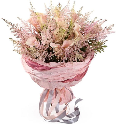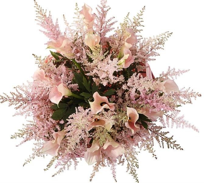 The Astilbe Bouquet is a refined and romantic flowers arrangement that combines the gentle elegance of pink Calla Lilies with the feathery beauty of pink Astilbe. Designed to evoke grace, tenderness, and sophistication, this bouquet is perfect for weddings, anniversaries, or heartfelt gestures. Together, these two blooms create a light, luxurious bouquet that blends structure with softness, ideal for brides, special events, or as a beautiful decorative accent.