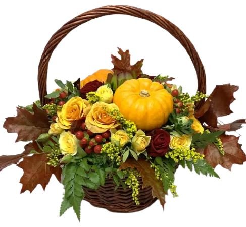 The Autumn Basket with Pumpkin is a festive and warm arrangement that captures the spirit of fall, blending rich colors and seasonal elements to create a cozy and inviting display. Autumn basket of mixed flowers with dark shades. The perfect flower arrangement for a gift! Make even a gloomy day some colour! The composition of yellow roses, solidago, red roses and pumpkins make an amazing impression.