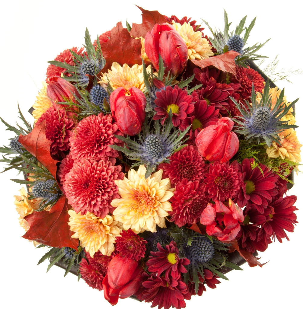 Welcome the warmth and beauty of autumn into your home with our stunning Autumn Flower Bouquet. Bouquet of chrysanthemum, red tulips and blue eryngium. Stunning autumn and winter composition. If you are looking for a flower bouquet to fit the holiday mood you cant find any better then our Autumn Flowers Arrangement. Our Autumn Flower Bouquet is perfect for adding a touch of seasonal beauty to any space. Whether you're celebrating a harvest festival, thanksgiving, or simply want to embrace the spirit of fall, this enchanting arrangement is sure to delight and inspire.
