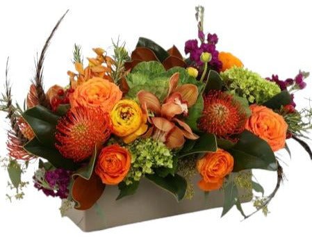 Embrace the rich and vibrant hues of the season with our Autumn Tones Box. This stunning arrangement captures the essence of autumn with an exquisite blend of fiery oranges, deep reds, and lush greens. Perfect for brightening any space or gifting during the fall season, this arrangement is a true reflection of autumn's natural beauty. The Autumn Tones Box is ideal for thanksgiving, housewarmings, or simply as a seasonal centerpiece to bring warmth and charm into any room. Its vibrant palette and elegant arrangement make it a versatile and memorable gift for any autumn occasion.