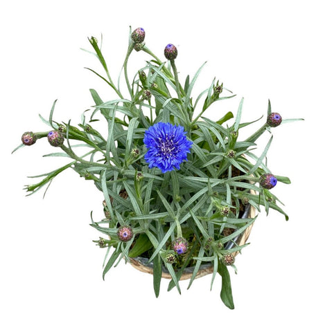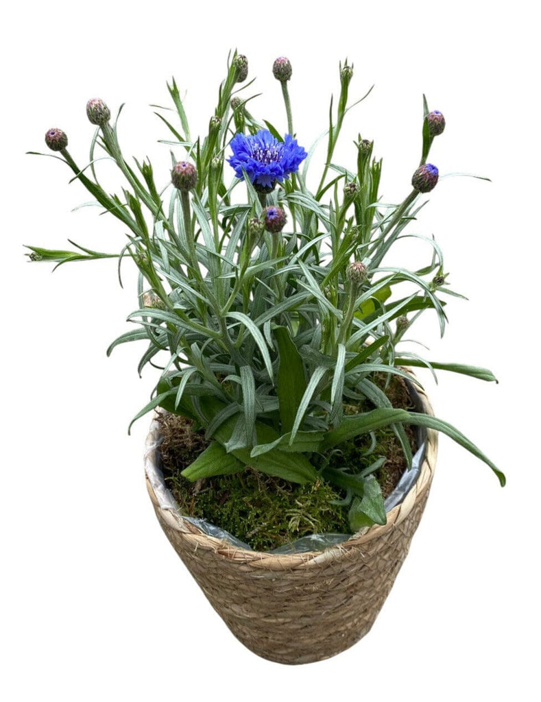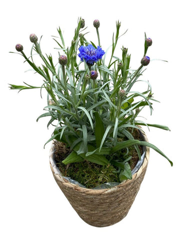 Whether you're shopping for a plant lover or adding to your own green collection, this Blue Cornflowers Pot in Basket is a delightful choice that captures the essence of wild beauty.