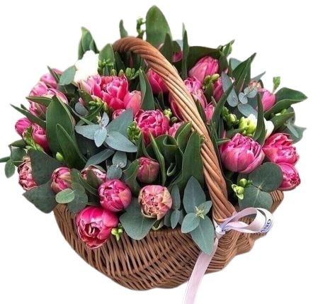 Indulge in the beauty of spring with the Basket of Double Tulips and Fragrant Freesias, a charming floral arrangement designed to bring joy and sophistication to any setting. This handcrafted basket blends the soft elegance of tulips with the delightful fragrance of freesias, enhanced by fresh eucalyptus for a natural and refreshing touch. Create a unique arrangement by selecting the perfect tulip shade. Perfect for any occasion - birthdays, anniversaries, thank-you gifts, or as a beautiful home décor piece.