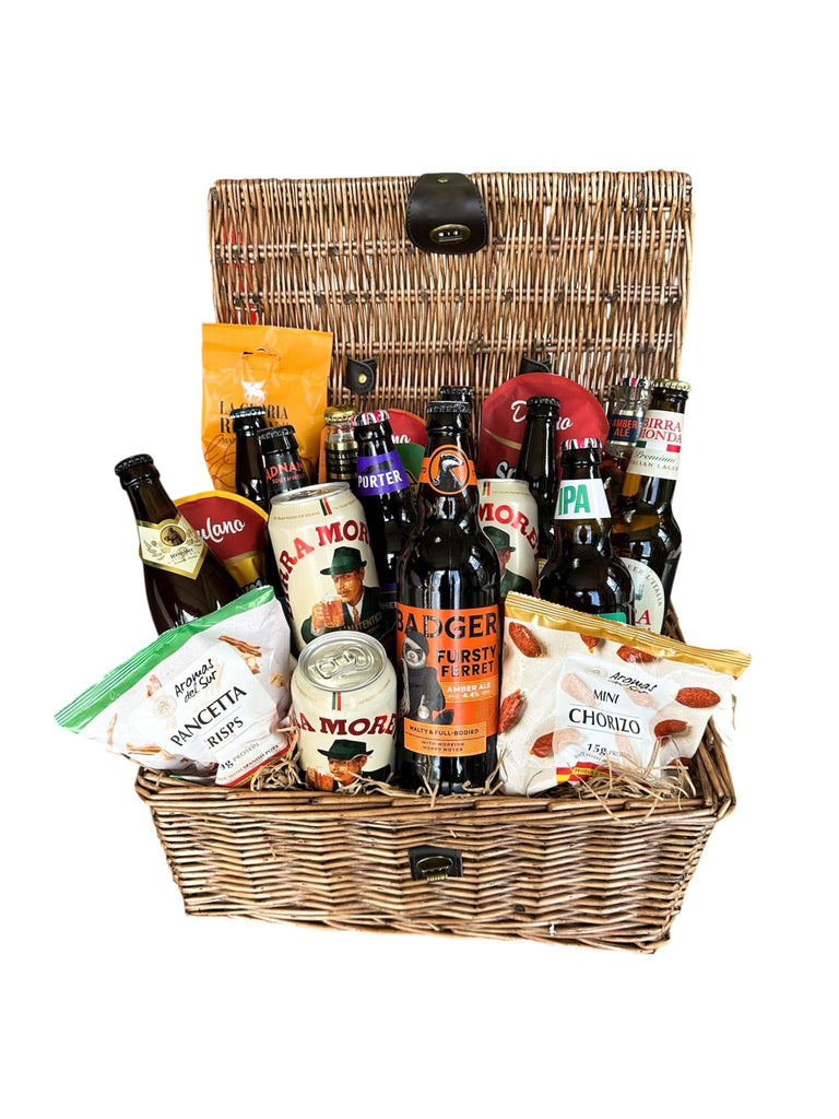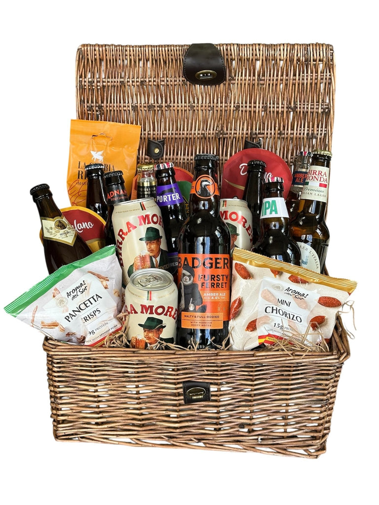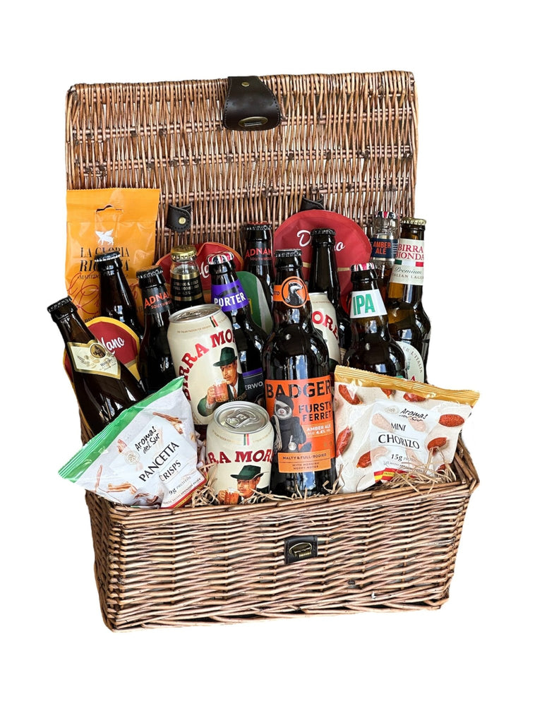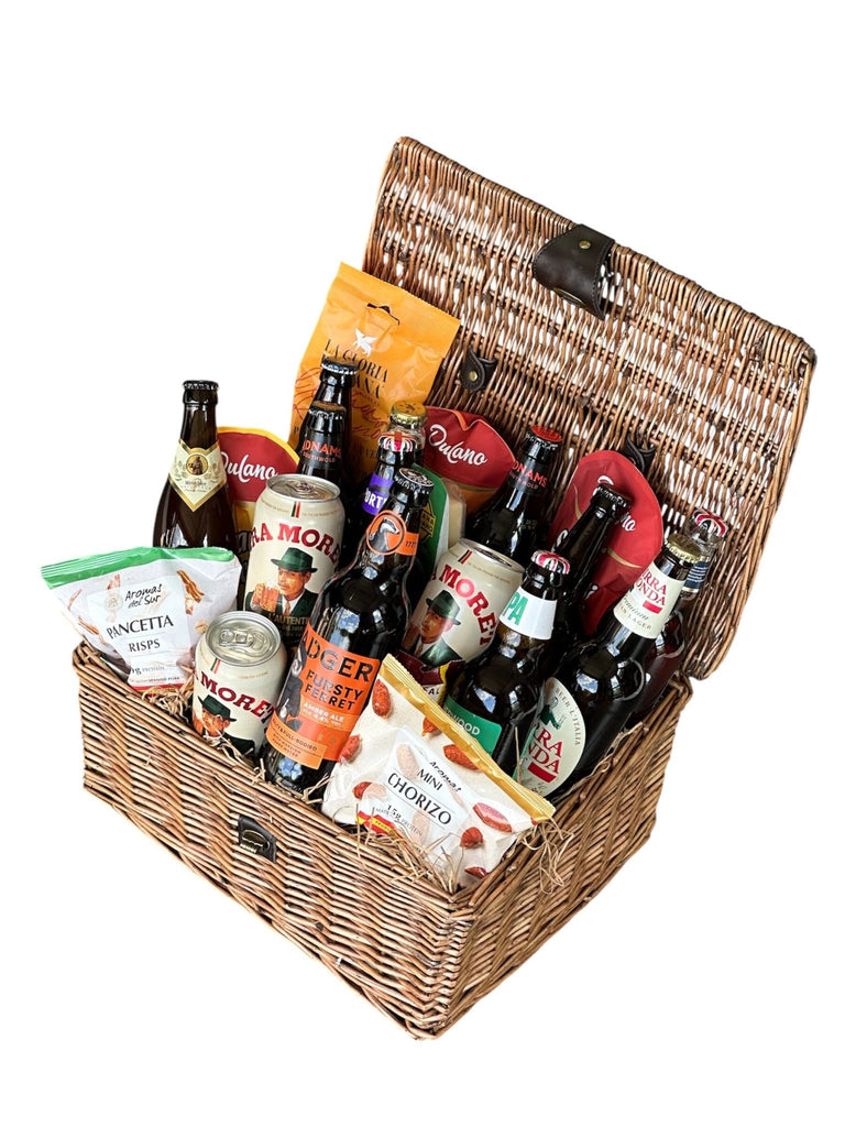 Please note the hamper basket pictured is the Large (14 beers + 7 snacks) size.