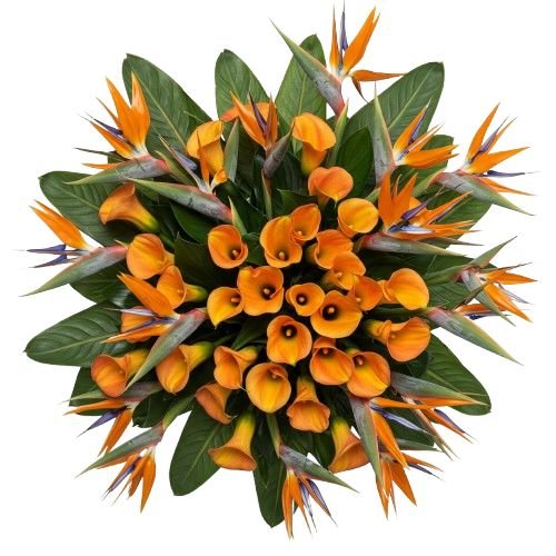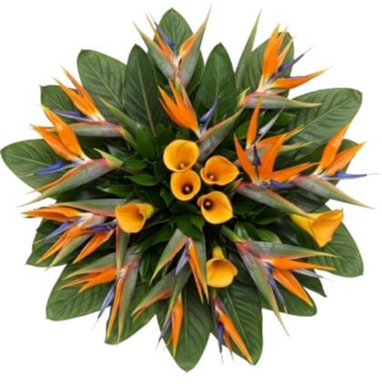 - Lush Greenery: completes this arrangement, enhancing the vibrancy of the Birds of Paradise and the elegance of the Calla Lilies. The foliage adds volume, depth, and balance, creating a harmonious display that feels both luxurious and natural.