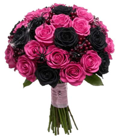 Add a dramatic twist to your floral gifting with our Black and Cerise Roses Spooky Bouquet, a striking arrangement designed to impress with its bold and mysterious charm. Perfect for Halloween or anyone who loves unique, unconventional flowers, this bouquet is both eerie and elegant. Featuring deep, dramatic black roses alongside vibrant cerise roses, the bouquet is accented with red hypericum berries for texture and richness. Finished with a playful artificial spider decoration, it brings a spooky yet stylish touch that makes it unforgettable. Make a bold statement with our Black and Cerise Roses Spooky Bouquet.