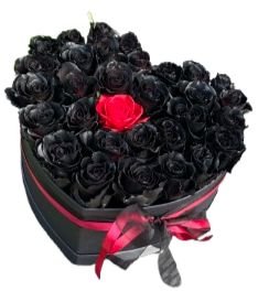 Discover the perfect blend of elegance and romance with our Black and Red Loving You Flower Heart Box. This exquisite floral arrangement features luxurious black roses paired with a single red rose, making it a unique and unforgettable gift for any occasion.