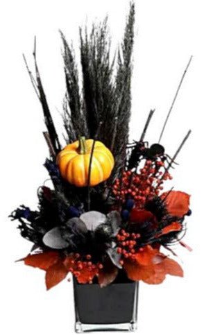 Bring a touch of spooky elegance to your home this season with our Black Autumn Arrangement in Glass Pot. This unique Halloween centerpiece combines dramatic black leaves, vibrant orange foliage, a charming mini pumpkin, rich orange berries, and striking black halloween decorations – all beautifully styled in a clear glass pot for a modern vintage feel. Perfect for adding a warm yet spooky Halloween atmosphere to your dining room, living room, or entryway table, this handcrafted autumn arrangement blends bold black tones with glowing orange accents for a truly eye-catching seasonal display. Whether you’re hosting a Halloween party, decorating your home for fall, or surprising a loved one with a festive gift, this Black Autumn Arrangement in Glass Pot makes the ideal choice.