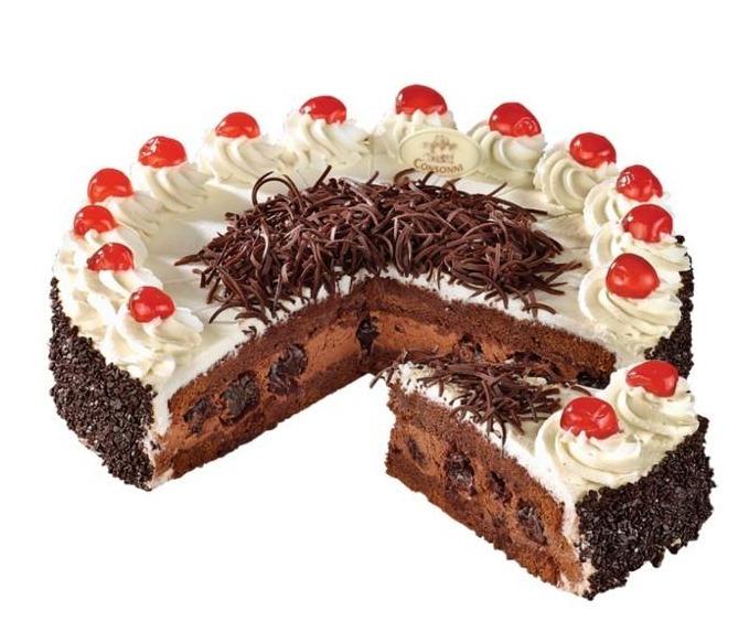 The "black forest" cake consists of a chocolate-flavored sponge cake with cherries in gel and mousses: cocoa-rum and cream-rum.