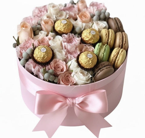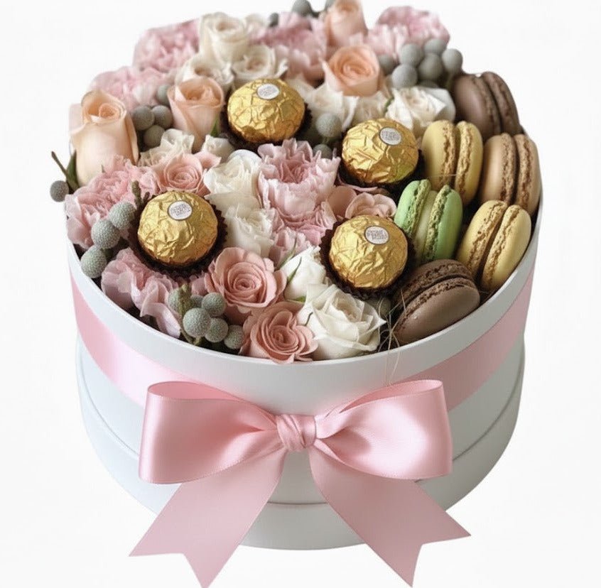 - Macaroons: colourful gourmet macaroons add a sweet, playful element to the box, complementing the soft floral tones with a touch of indulgence.
