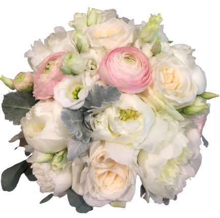 The Blooming Song Bouquet is a harmonious blend of soft pastels and delicate textures, combining the beauty of pink ranunculus, white peonies, peach garden roses, and white lisianthus. Accented by the refreshing greenery of stachys leaves, this bouquet creates a soft, romantic, and fresh floral arrangement that exudes elegance and charm.