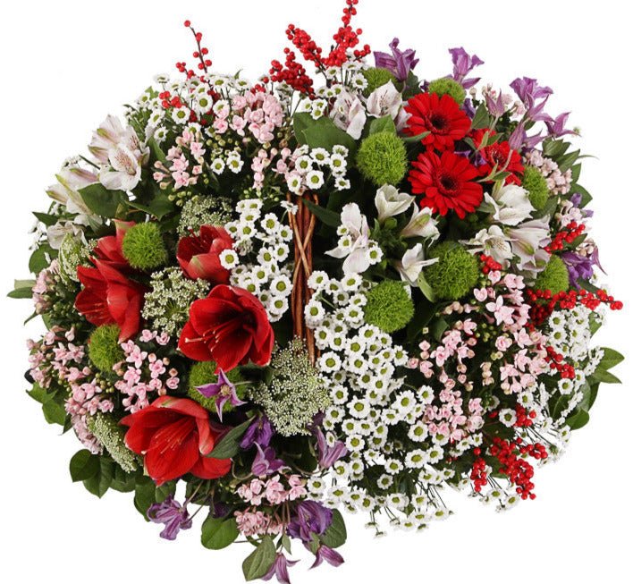 Blossoms of Ruby Delight Basket – A Vibrant Symphony of Colors and Textures
