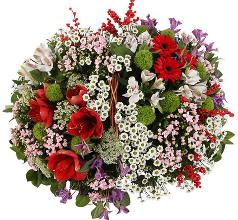 Celebrate nature’s beauty with the Blossoms of Ruby Delight Basket, a luxurious floral arrangement bursting with vibrant colors, rich textures, and seasonal charm. This exquisite basket combines an array of striking blooms, creating a breathtaking display that is perfect for gifting or as a centerpiece to elevate any space. The Blossoms of Ruby Delight Basket is more than just a floral gift — it is a statement of elegance, passion, and thoughtfulness. Its vibrant red tones paired with calming whites, playful greens, and striking purples create a mesmerizing balance that works beautifully for festive occasions, heartfelt celebrations, or as an elegant gift to express love and admiration.