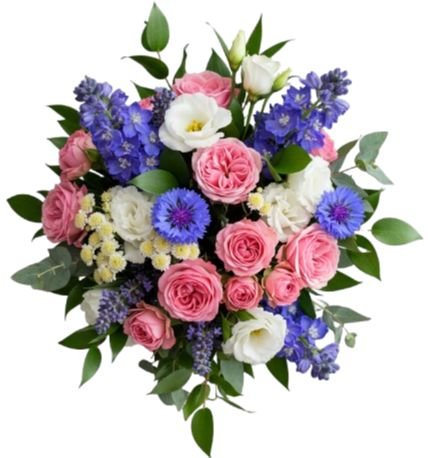 - White Tanacetum: with their dainty, button-like blooms adding texture and depth to the bouquet. These flowers symbolize resilience and courage, complementing the delicate beauty of the pink and blue blossoms.