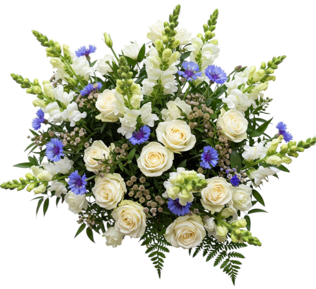The Blue and White Bouquet of Roses and Cornflowers is a fresh and elegant arrangement that beautifully balances crisp white blooms with vibrant blue accents. With its classic color palette and graceful textures, this bouquet exudes serenity, refinement, and natural charm. The white snapdragons, white roses, blue cornflowers, and greenery create a beautifully balanced bouquet — ideal for weddings, celebrations, or as a heartfelt gift that captures both elegance and joy.