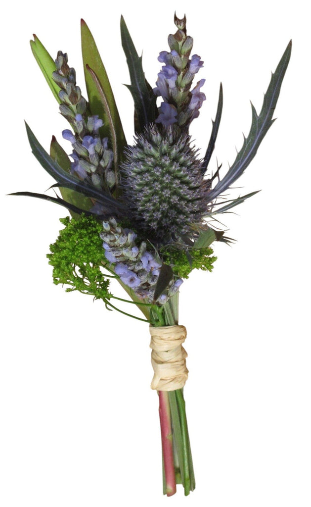 - Blue Eryngium: known for its bold, spiky texture and vibrant blue color, blue eryngium brings a unique, contemporary flair to any boutonniere. It symbolizes strength, resilience, and protection, making it a meaningful and stylish choice.