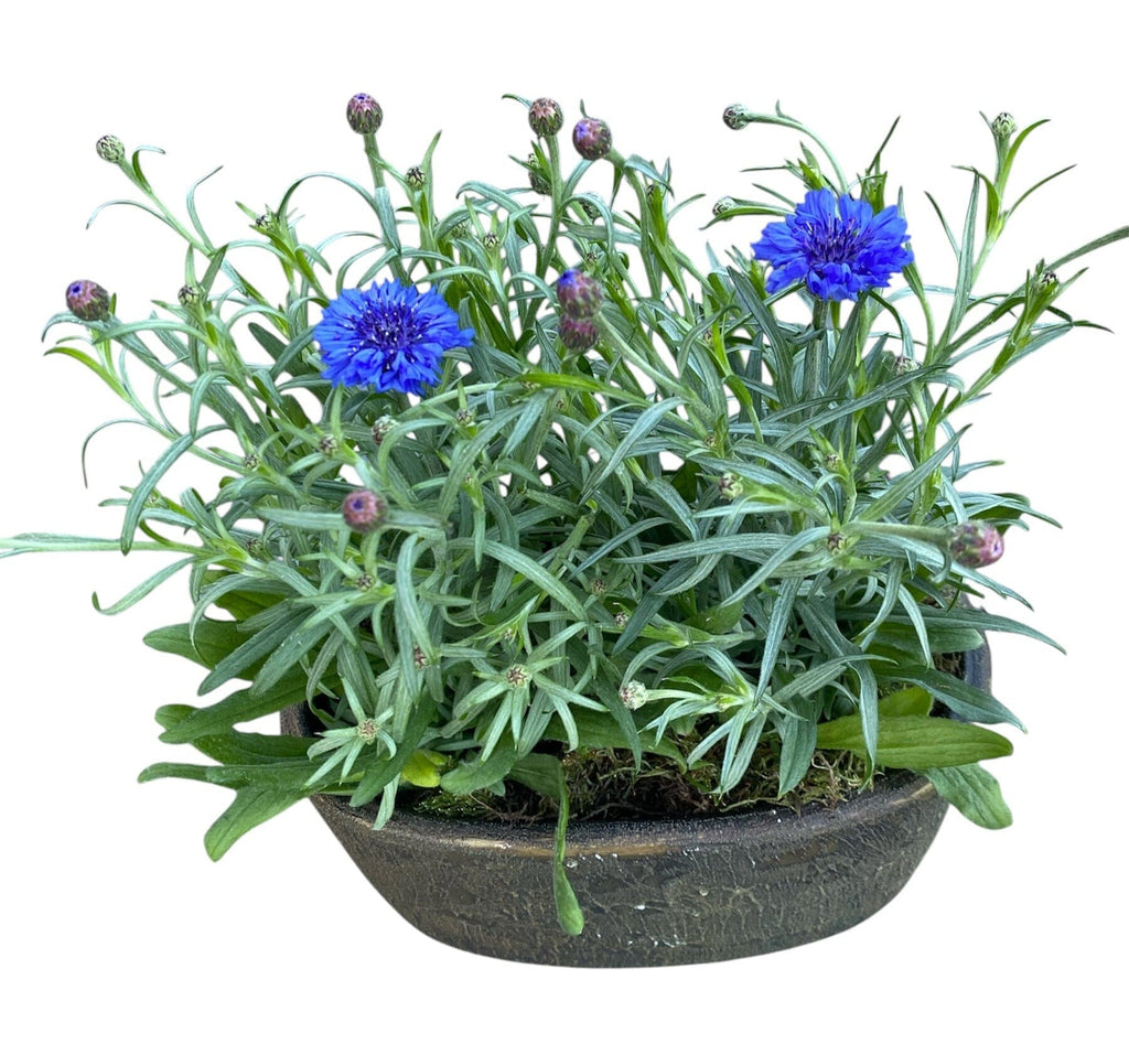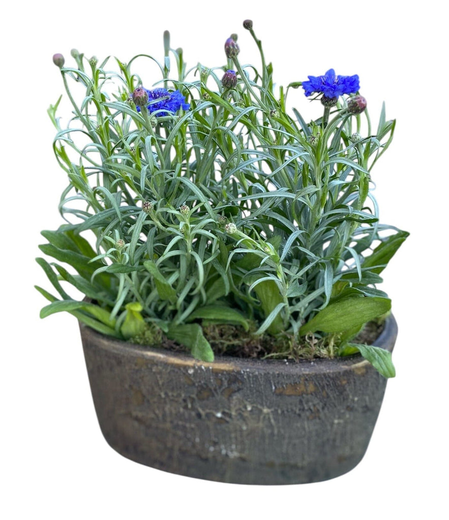 The Blue Cornflowers Plant in an Elliptic Ceramic Pot from Flowers Box London is a beautiful, rustic arrangement that brings natural elegance to any room. Ideal for gifts or home décor.