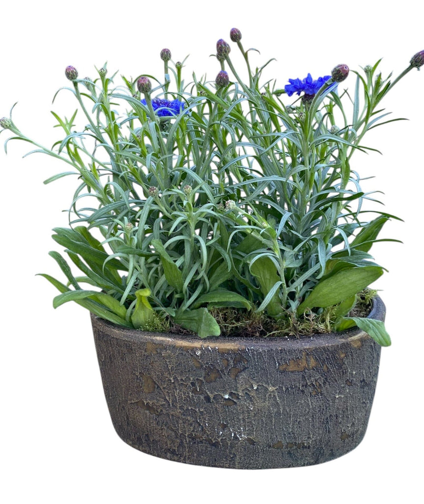 - Elliptic Ceramic Pot: adds a sleek and modern contrast to the soft beauty of the cornflowers. Its smooth, elongated oval shape offers a unique and stylish base that complements both contemporary and rustic décor. The ceramic finish provides durability and sophistication, making it not just a plant container but also a decorative element in its own right.