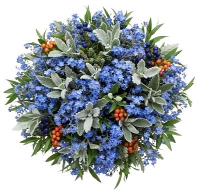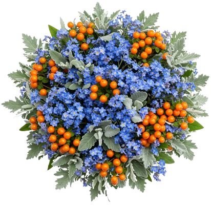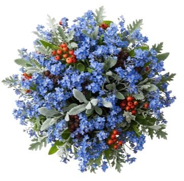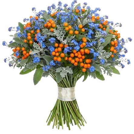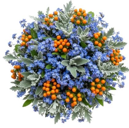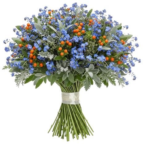 Delicate and striking, the Blue Forget Me Not Bouquet with Orange Berry is a celebration of color, texture, and natural beauty. Featuring the charming elegance of blue forget-me-nots, this bouquet symbolizes love, remembrance, and lasting connections. Bright orange rowan berries add a vibrant contrast, creating a cheerful pop of seasonal warmth, while soft stachys leaves (silver leaves) bring a velvety touch and a refined, silvery-green backdrop.