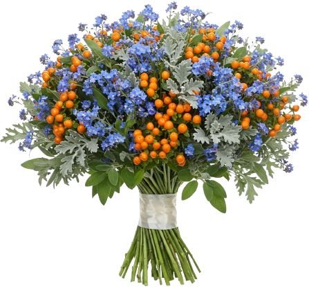 This unique blend of blooms and foliage makes the bouquet a thoughtful gift for special occasions or a beautiful accent to any space. Its harmonious mix of bold and soft elements creates a natural yet luxurious design, perfect for expressing affection, gratitude, or autumn celebration. Hand-tied with care, the Blue Forget Me Not Bouquet with Orange Berry is both refreshing and timeless — an elegant gesture that will leave a lasting impression.