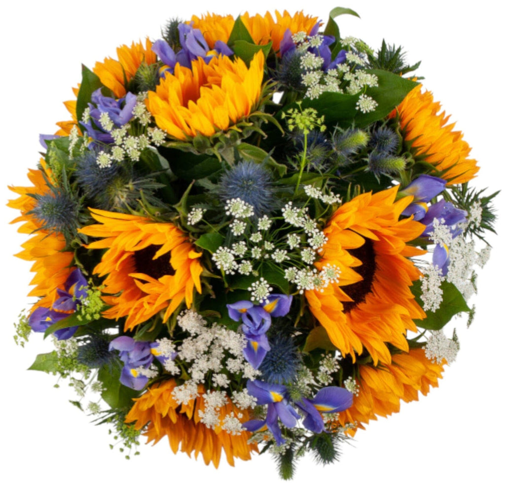 The Blue Iris with Sunflowers Bouquet is a radiant and eye-catching arrangement that combines the sunny warmth of sunflowers with the cool elegance of blue florals. Designed to inspire joy and admiration, this bouquet is perfect for brightening any occasion or space with vibrant color and texture. Ideal for birthdays, celebrations, or as a thoughtful gift, the Blue Iris with Sunflowers Bouquet is a perfect blend of sunshine and serenity. Celebrate color and contrast with this vibrant bouquet. The Blue Iris with Sunflowers Bouquet is sure to leave a lasting impression!