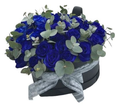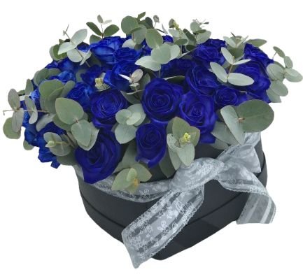 The contrast of the striking blue roses and the fresh eucalyptus creates a perfect balance of beauty and freshness. Presented in a sleek, high-quality box, this floral arrangement makes a sophisticated gift for special occasions such as anniversaries, birthdays, or just to express admiration.