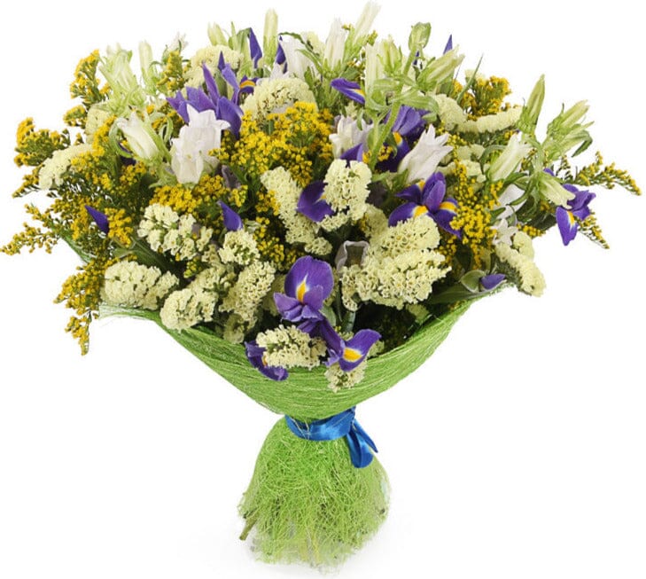 - Blue Irises: add a bold contrast that perfectly echoes the vastness of clear skies. Known to symbolize hope and faith, these blooms bring depth and vibrancy, completing the bouquet’s joyful and serene palette.