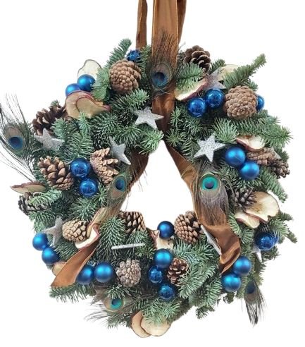 Ideal for front doors, fireplaces, or as a centerpiece, the Blue Winter Wonderland Wreath is a versatile addition to your holiday decorations. Its unique mix of elements — from festive baubles to natural pine cones and the bold beauty of peacock feathers — makes it the perfect statement piece for any winter celebration.