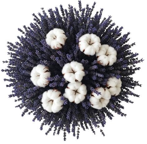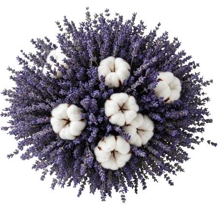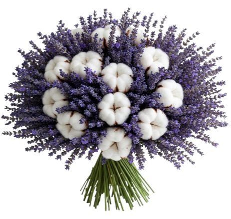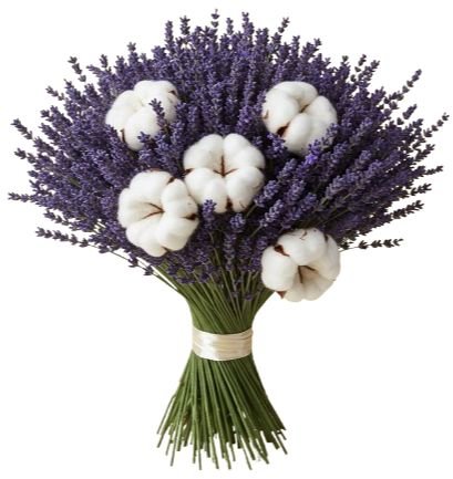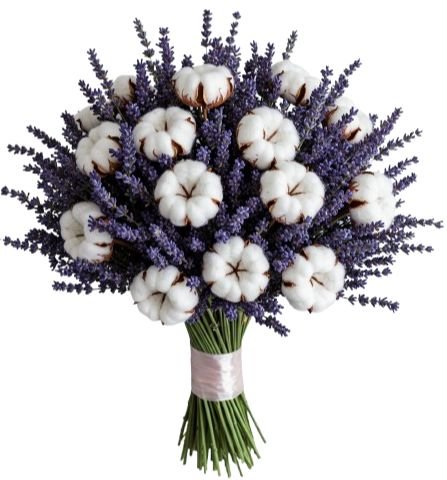 - White Cotton: fluffy and pure, cotton stems create a striking contrast with lavender, offering texture and a natural rustic look.