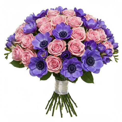 Delicate, romantic, and full of charm — our Bouquet of Anemone with Roses and Freesias is a graceful floral arrangement that captures the essence of spring. With a carefully curated blend of pink roses, light pink roses, purple freesias, and striking blue anemones blooms, this bouquet is perfect for expressing love, appreciation, or simply brightening someone’s day.