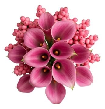 - Pink Snowberry: bring a whimsical and charming touch to the arrangement. Their soft blush tones add warmth and contrast beautifully with the striking form of the calla lilies. Beyond their aesthetic appeal, snowberries carry a sense of enchantment and natural beauty, often associated with gentle affection and the wonders of nature. Their rounded shapes also add depth and texture, giving the bouquet a lush, abundant feel.