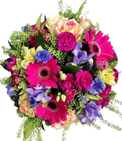 Brighten any occasion with our exquisite Bouquet of Cerise and Blue Flowers, a perfect blend of vibrant hues and fresh blooms. This stunning arrangement features a beautiful mix of cerise gerbera, blue cornflowers, blue iris, yellow alstroemeria, yellow spray roses blooms, cerise spray carnations, and green bell — a true celebration of color and life.