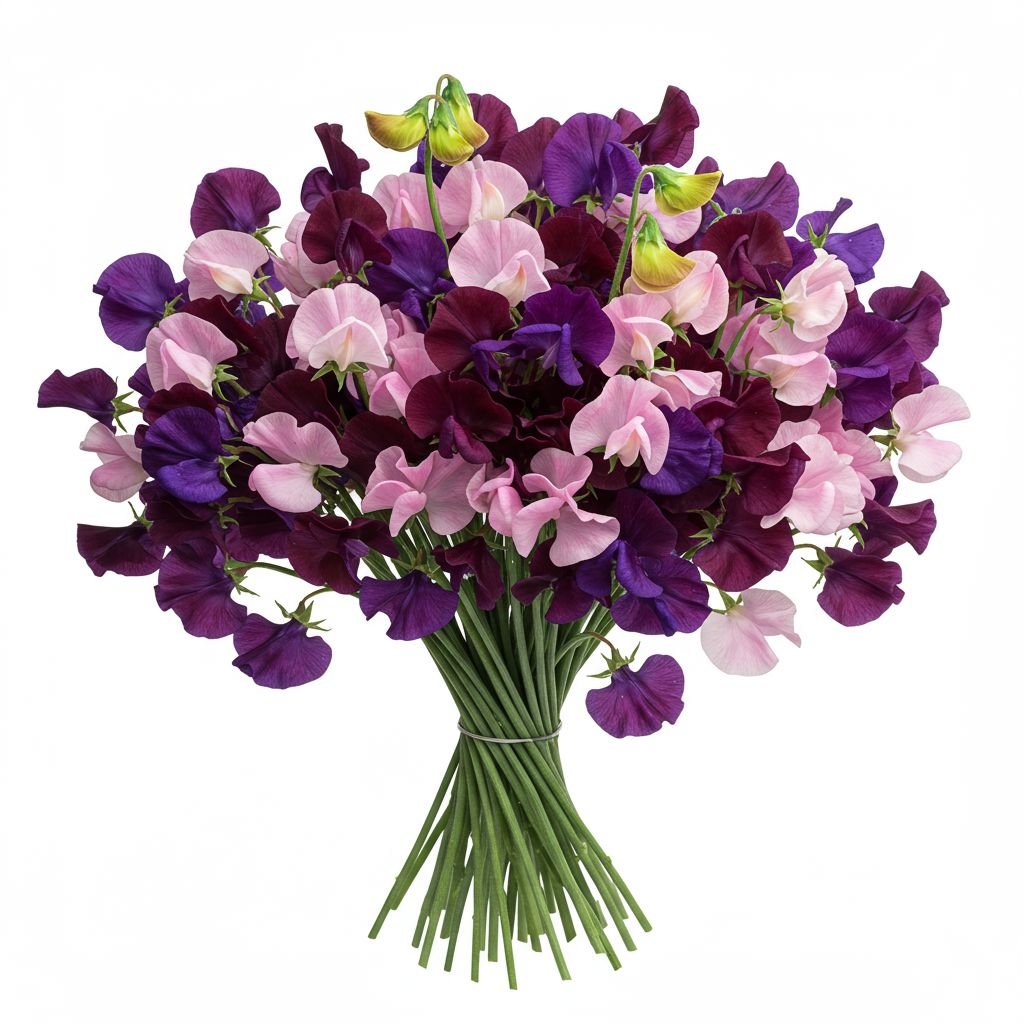 - Deep Purple Sweet Pea: rich and velvety in tone, these blossoms exude elegance and depth. They symbolize dignity, admiration, and heartfelt sentiment, adding a dramatic accent to the bouquet.