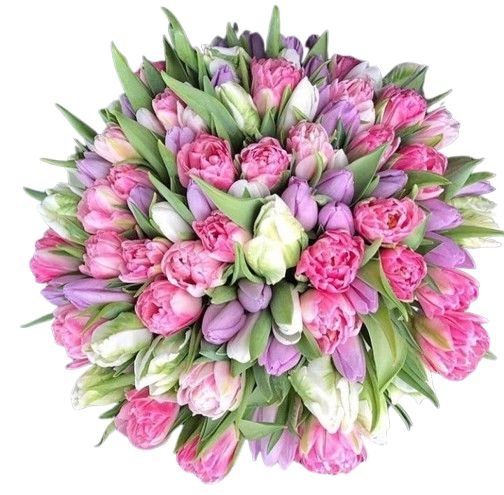 This exquisite bouquet features a captivating combination of double pink tulips, double white tulips, and a subtle lavender tulip accent, creating a soft, romantic vibe. The rich pink and white blooms represent elegance and purity, while the lavender tulips add a touch of tranquility and charm.