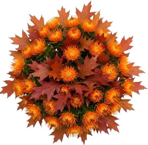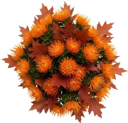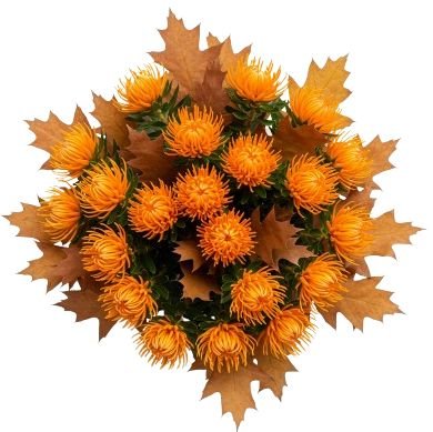 - Orange Oak Leaves: adding a warm, autumnal flair, the oak leaves in rich orange tones provide a rustic backdrop. Their earthy texture perfectly complements the striking form of the leucospermum, creating balance and depth.