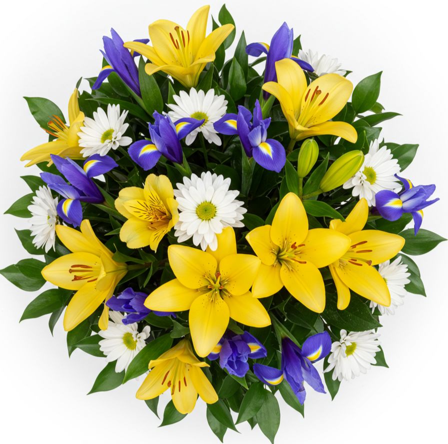 Celebrate elegance and natural beauty with the Bouquet of Lily and Blue Iris with Daisy Leucanthemum — a vibrant, fresh arrangement that radiates charm and grace. Whether you’re marking a special occasion or simply brightening someone’s day, this bouquet is a perfect choice. Fresh, seasonal flowers arranged with care and attention to detail - ideal for birthdays, anniversaries, get-well wishes, or as a "just because" gift.