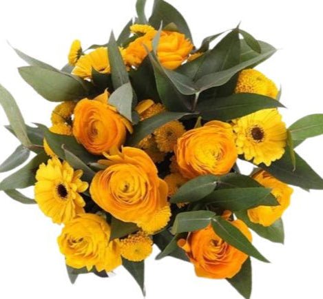 Bring a burst of color and cheer to any occasion with our Bouquet of Orange Ranunculus and Gerberas. This stunning arrangement combines the delicate beauty of orange ranunculus, the cheerful brightness of yellow gerberas, and the rich tones of orange santini chrysanthemums, all wrapped in a fresh, vibrant greenery backdrop.
