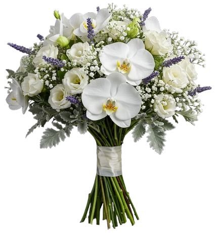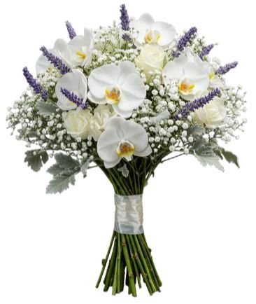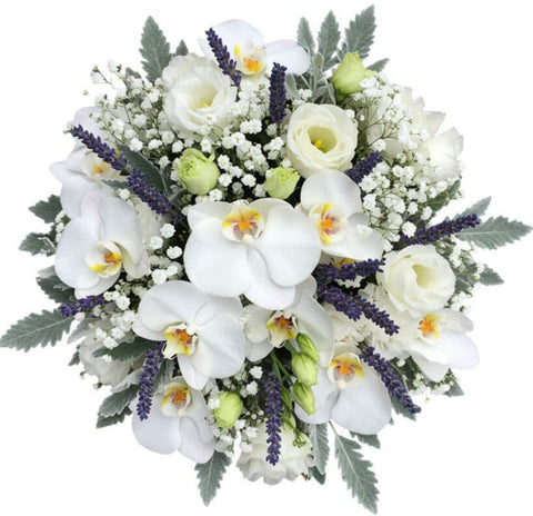 The Bouquet of Phalaenopsis Orchids with Lisianthus and Lavender Accent is a statement of elegance, blending the purity of white blooms with the charm of fragrant lavender and silver foliage. The graceful phalaenopsis orchids bring sophistication and lasting beauty, while the delicate lisianthus adds softness and charm. Finished with gentle lavender accents, this bouquet offers both fragrance and style, making it a perfect choice for weddings, anniversaries, romantic gestures, or heartfelt celebrations.