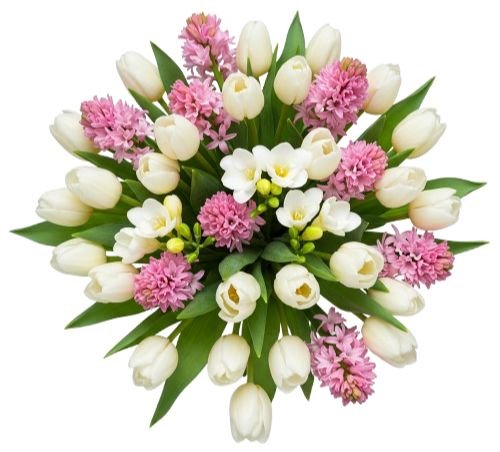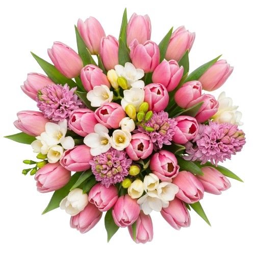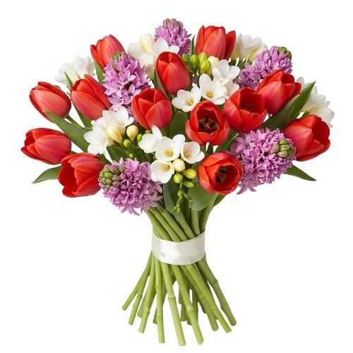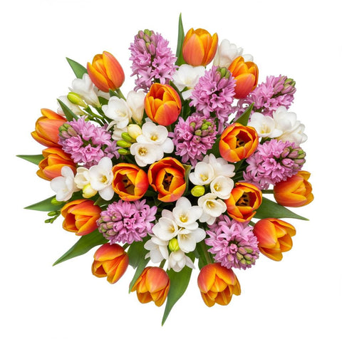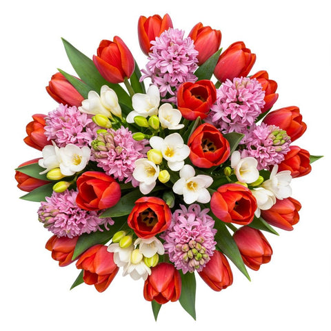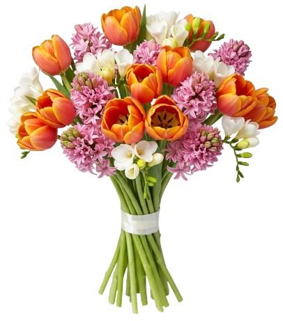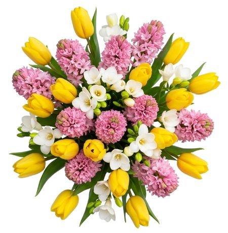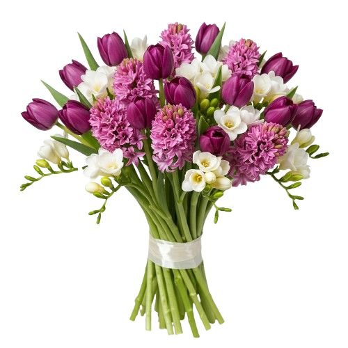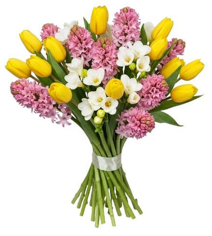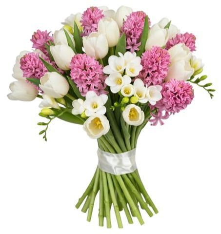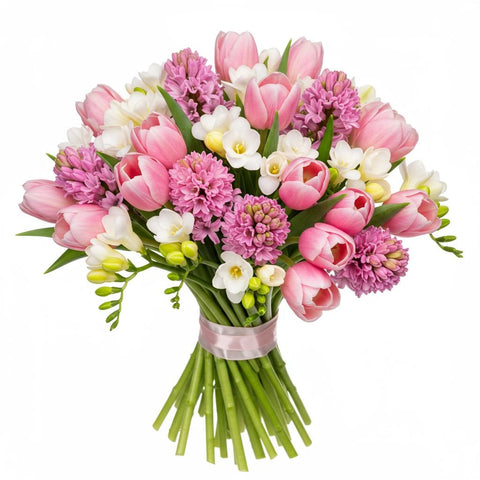 Introducing our enchanting Bouquet of Pink Hyacinth and Tulips with Freesias, a delightful arrangement that combines the sweet fragrance blooms of pink hyacinths with the vibrant beauty of tulips, accented by the delicate blooms of white freesias and lush greenery. Each element is thoughtfully selected to create a captivating composition that evokes feelings of joy and elegance.
